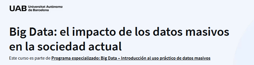 Coursera: Curso Big Data: el impacto de los datos masivos en la sociedad actual:+ de 38.000 inscritos. Organizado por UAB (Universitat Autònoma de Barcelona).